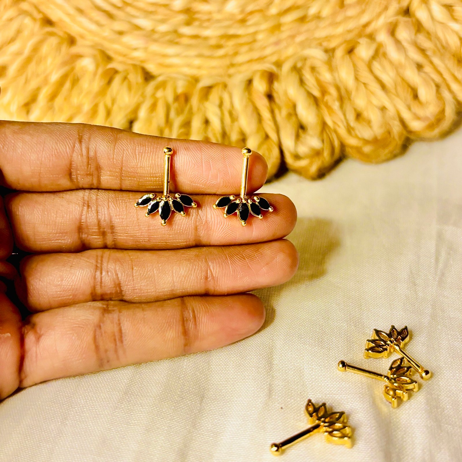 black bugadi,Elevate your everyday style with these elegant gold-tone floral stud earrings. Designed with a sleek vertical bar and a delicate fan of petal-shaped black stones, each piece blends modern minimalism with a touch of vintage charm.